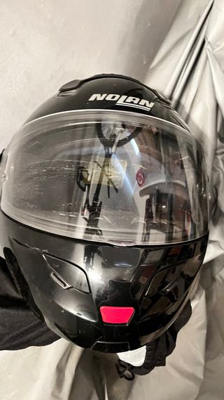 Casco de moto modular de la marca Nolan. - Color negro brillante. - Visera transparente. - Cierre de seguridad. tiene arañazos del uso, y hueco para comunicador