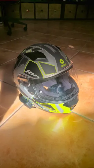Casco de moto de la marca Shark con un diseño moderno. Tiene uso y tiempo pero todavía funcional. Almohadillas lavadas. - Color gris con detalles en amarillo. - Visera transparente. - Cierre de seguridad.