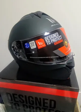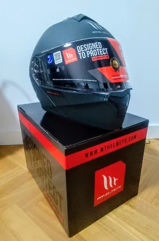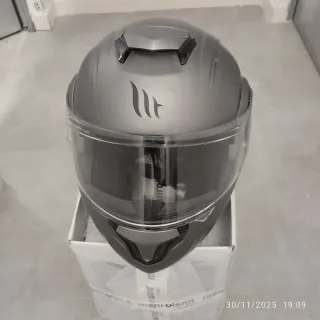 Casco de moto integral con acabado gris mate y visera transparente. - Diseño deportivo. - Logo de la marca MT en la parte superior. - Visera con protección.