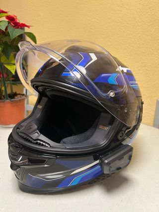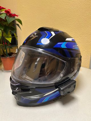 Casco de moto Scorpion EXO con diseño deportivo en tonos azules y negros. NO Incluye un sistema de comunicación Bluetooth. Si incluye pantalla antivaho y otra pantalla más. - Diseño deportivo. - Colores: azul y negro. - Talla L adjunto ticket de haberse comprado el 13 de Diciembre del 2025