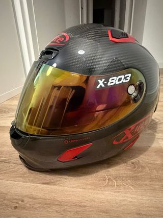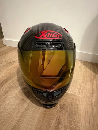 Casco de moto integral con acabado en fibra de carbono y visera dorada. - Diseño deportivo y aerodinámico. - Marca X-lite. - Material: Fibra de carbono. - Incluidos en el precio los accesorios de la foto. - Como nuevo.