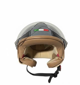 Casco de moto estilo vintage con detalles de la bandera italiana. - Diseño abierto. - Visera transparente. - Interior acolchado para mayor comodidad. - Correa ajustable con cierre de seguridad.
