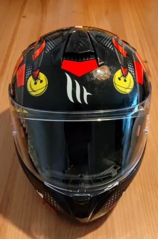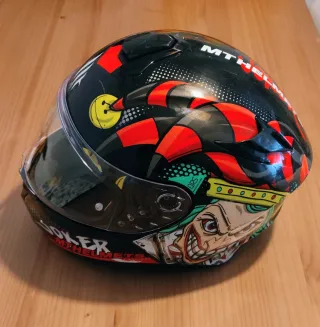 Casco integral con diseño inspirado en Joker. Talla M. - Color negro con detalles rojos y amarillos. - Visera transparente nueva a estrenar. - Logo de MT visible.