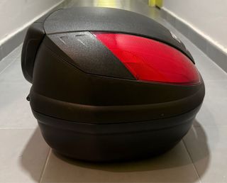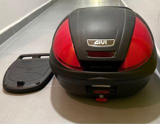 Baúl Givi E370 Monolock 39L en color negro con detalles en rojo ideal para guardar un casco integral y pertenencias. - Diseño Monolock. - Acabado en negro y rojo. - Incluye placa base Monolock