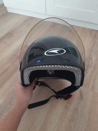 Casco de moto estilo jet, ideal para trayectos urbanos. Su diseño abierto ofrece buena ventilación. Talla S. - Color negro brillante. - Visera transparente. - Cierre de correa ajustable.