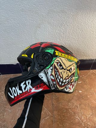 Casco de moto MT Helmets con diseño Joker. - Diseño llamativo del Joker. - Estampado de cartas de póker. - Acabado negro con detalles en rojo y verde. - sin visera