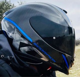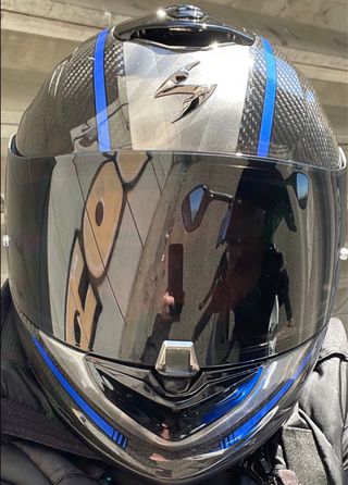 Casco integral Scorpion Exo 1400 Air Carbon con diseño Gran Azul. MUY NUEVO CON POCO USO - Calota de fibra de carbono. - Sistema de inflado Airfit. - Visera clara. - Talla S.