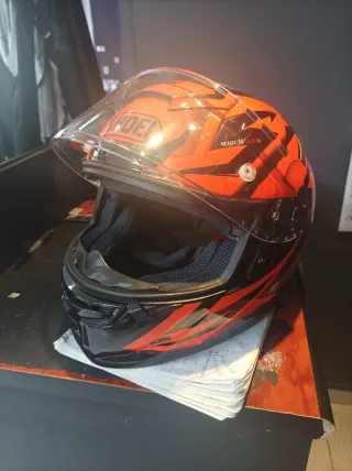 Casco de moto con un diseño llamativo en naranja y negro. - Marca Shoei. - Visera transparente. - Interior acolchado.