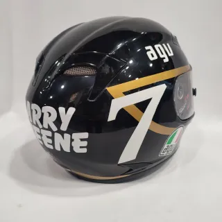Casco integral Agv T2 Barry Sheene en talla XS (53/54 cm). Diseño deportivo con detalles en dorado y blanco sobre fondo negro. En perfecto estado interior y exterior - Cierre de doble anilla. - Visera clara. - Interior extraíble y lavable.