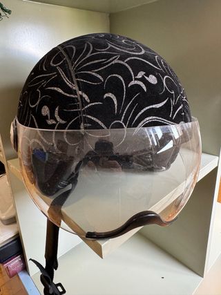 Casco de moto con un diseño llamativo y moderno. Ideal para protegerte en tus trayectos. - Diseño con motivos de plumas en tonos morados y plateados sobre fondo negro. - Visera transparente. - Peso: 1.300 g. Se ha usado 2 veces, está nuevo, costó 650€.
