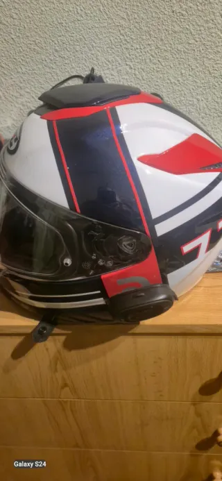Casco de motocicleta HJC con diseño deportivo. - Color blanco con detalles en negro y rojo. - Visera transparente. - Marca HJC HELMETS.INTERCOMUNICADOR Sena rdk EASY+Negro Pinlock, Talla M,cierre doble hebilla.
