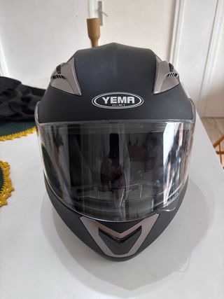 Casco integral de la marca YEMA en color negro con funda - Diseño aerodinámico. - Visera transparente. - Detalles plateados en la parte superior y frontal.