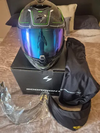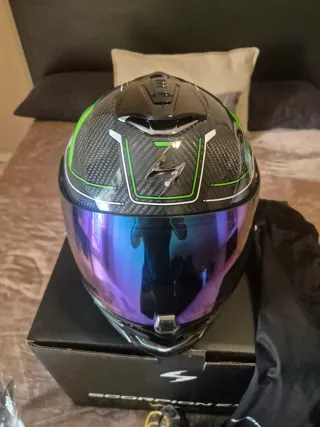 Casco Scorpion Exo 1400 Air Talla S con su caja. Tiene acabados en carbono y tonos verdes y blancos. El casco tiene 2 años y muy poco uso ya que era solo el que usaba los fines de semana. La Visera transparente y la oscura están sin estrenar ya que le puse esta cromada en tonos verdes. No tiene ningún rasguño ni caída ni nada. - Diseño deportivo y ligero. - Interior confortable.