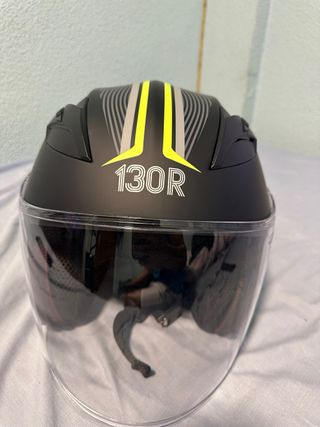 Casco de motocicleta negro con detalles en amarillo y gris. Cuenta con una visera transparente. - Diseño deportivo. - Modelo 130R.