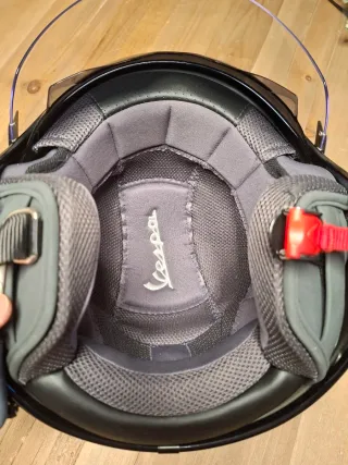 Casco jet Vespa VJ en color negro. Carcasa de ABS. Inscripción Vespa grabada en la parte superior y en el mecanismo de la visera. Visera solar retráctil (teñido oscuro). Visera completamente transparente. Barboquejo con sistema de retención micrométrico. Forro extraíble, lavable y transpirable Bordes de concha negros brillantes Soportes de visera de carbono real Nuevo, en perfecto estado. Talla M