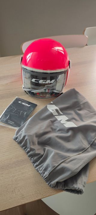 Casco de moto CGM de color rosa brillante, con visor transparente. Incluye bolsa de tela para guardarlo y manual de instrucciones. Talla YS 49-50cm Nuevo sin estrenar - Casco CGM - Color rosa - Visor transparente - Bolsa de tela - Manual de instrucciones