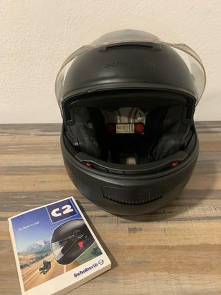 Casco de moto Schuberth C2 en color negro, talla 54/55. Se incluye manual de instrucciones. El casco está en buen estado, con desgastes del uso, no ha sufrido golpes, le falta el forro interior, se pueden conseguir en la casa oficial, tiene para instalar intercomunicador y visera oscura para protección del sol. Muy ligero y cómodo. - Marca: Schuberth - Modelo: C2 - Color: Negro - Talla: 54/55 - Incluye manua