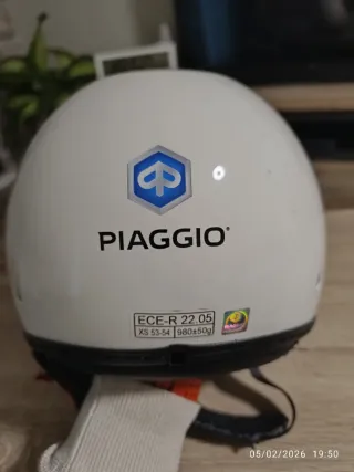 Casco jet de la marca Piaggio en color blanco. - Talla XS (53-54 cm). - Homologación ECE-R 22.05. - Peso aproximado 980±50g.