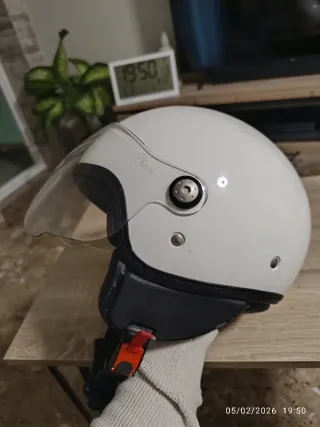 Casco de moto de estilo abierto, color plateado con detalles en blanco y dorado. Incluye visera transparente. El cristal tiene algunos rasguños de uso. Talla S - Diseño moderno y aerodinámico. - Acabado brillante. - Visera con protección. - Ventilación integrada.