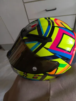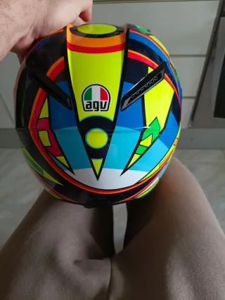 Casco de moto AGV K1 con diseño inspirado en Valentino Rossi. - Diseño colorido y llamativo. - Visera oscura. - Logo de AGV en la parte superior. Talla S