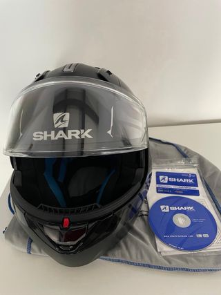 Casco de moto Shark Evo-One 2 Lithion Dual con un diseño moderno y llamativo. Está nuevo, solo usado una vez. Doble homologación P/J, talla M. Incluye pantalla antivaho. - Color negro y plateado. - Gráficos lineales y geométricos. - Visera transparente.