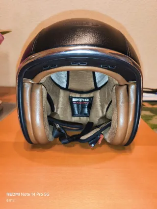 Casco de moto Shiro con acabado en acabado en piel sintética negra. Marca: Shiro Tipo: Jet / Abierto Talla: S Estilo: Vintage / Clásico Color: Negro, con ribete cromado. Interior camel. - Diseño clásico. - Detalle de costuras. - Borde metálico. Poco uso está como nuevo (se entrega lavado).