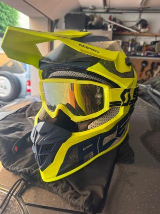 Casco de moto con un diseño llamativo y moderno. Incluye gafas integradas y protector facial. - Diseño con franjas verdes y grises. - Acabado mate. - Correa ajustable.