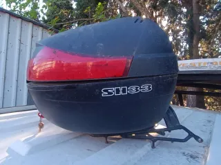 Baúl porta cascos para moto, modelo SH33. En buen estado con llave - Color negro. - Diseño aerodinámico. - Incluye cerradura y llaves.