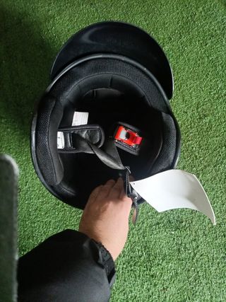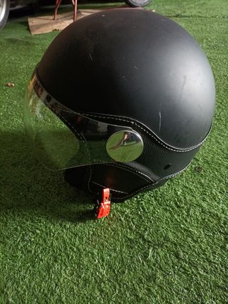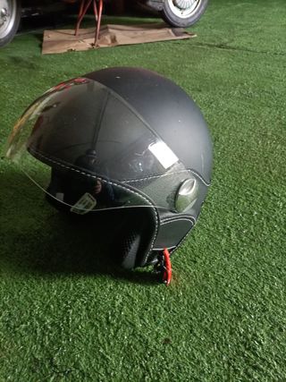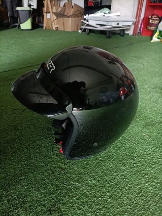 Casco homologado, con almuadillas interiores desmontables para poder lavarlas y con visera oscura. Anilla rapida de apertura. 3 años de uso. Talla mediana.