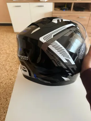 Casco Scorpion EXO con un diseño moderno y llamativo. - Color base negro. - Patrón gráfico en tonos grises y blancos. - Visera transparente. Usado un mes