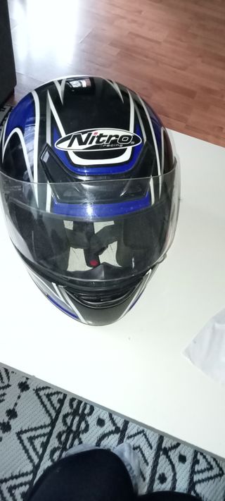 Casco de moto con diseño deportivo y visera. - Color negro con detalles en azul y blanco. - Marca Nitro Racing. - Visera transparente.