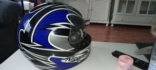 Casco integral de moto con un diseño deportivo y llamativo en tonos azules, negros y plateados. La visera ofrece una visión clara. - Diseño Nitro Racing. - Colores: azul, negro, plateado. - Visera transparente. - En mi perfil tengo otras cosas.