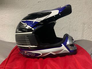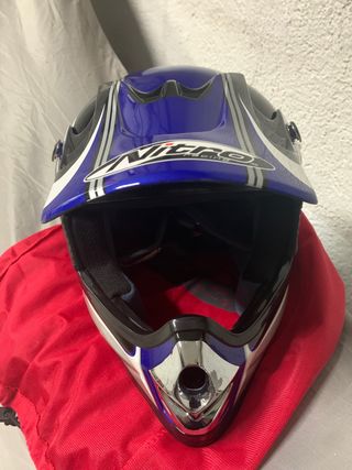 Casco de motocross junior de la marca Nitro Mx411. - Color azul, negro y blanco. - Visera integrada. - Interior acolchado. - Talla L. En perfecto estado.