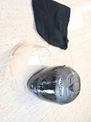Casco de moto Nitro en color gris oscuro y negro, con visera transparente y funda protectora. -le falta la almohadilla de la barbilla pero no influye. - Visera de recambio nueva. - Casco integral. - Visera transparente. - Incluye funda de tela negra.