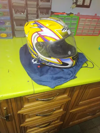 Casco de moto Nitro en talla S. Diseño deportivo con detalles en amarillo y negro. - Visera transparente. - Interior acolchado.
