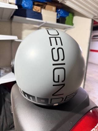 Casco de estilo retro en color gris. Presenta un diseño gráfico en negro. - Diseño DESIGN en la parte superior. - Detalle MOMO en la parte inferior.