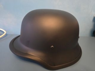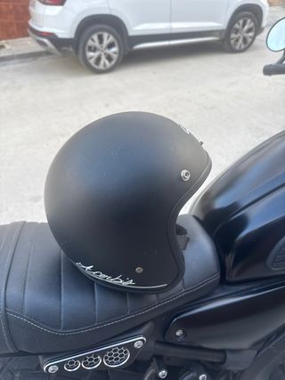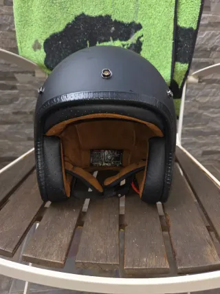 Casco de moto estilo retro y vintage en color negro. Diseño clásico para un look auténtico. - Exterior en acabado mate. - Interior forrado en material confortable. - Ribete perimetral con detalle. - Cierres metálicos para accesorios. No tiene visera Hay que retocar un poco la pintura