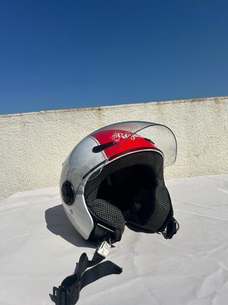 Casco integral de estilo retro de la marca Moto Guzzi. - Diseño clásico. - Acabado plateado con detalles rojos y azules. - Talla M disponible - Completamente nuevo a estrenar - Somos concesionario oficial Moto Guzzi en Ibiza