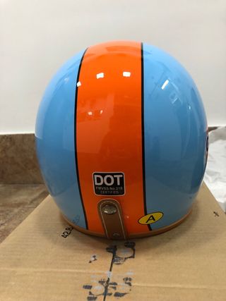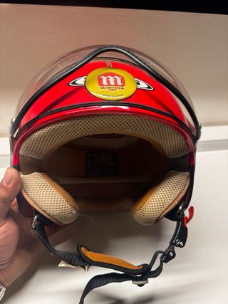 Casco de moto con un diseño retro y llamativo. Uno una talla M y otra una talla S - Visera negra. - Detalles en blanco y rayas azules. - Ribete marrón. Con una visera repuesto