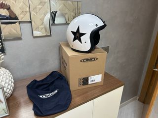 Casco jet DMD modelo Retro Star en color blanco. Diseño retro con estrella negra. Pvp 259€. - Color: Blanco - Diseño: Estrella - Talla: XS - Incluye bolsa de tela para guardarlo.