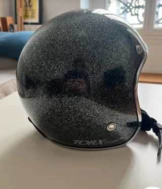 Casco de moto con un diseño clásico y acabado brillante. Marca torx. Modelo wyatt - Exterior con acabado de purpurina plateada. - Interior forrado en color burdeos. - Cierre de correa ajustable.