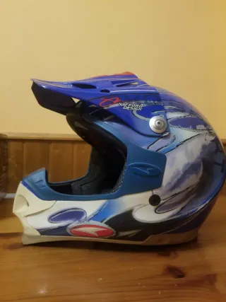 Casco de moto vintage con un diseño llamativo en tonos azules y blancos. Ideal para coleccionistas o para quienes buscan un estilo retro. - Diseño con gráficos abstractos. - Visera aerodinámica. - Acolchado interior. Diseño ganador del mundial.