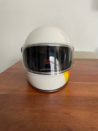 Casco de moto estilo retro, talla S, de la marca Bandit. Se encuentra en perfecto estado, casi nuevo. - Diseño clásico. - Color blanco con franjas negras.