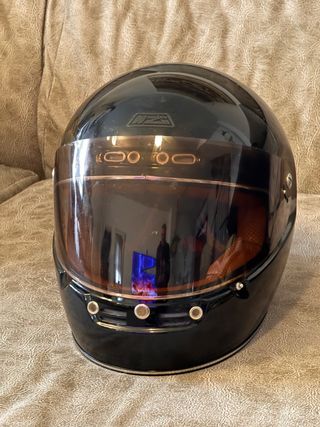 Casco integral NZI estilo cafe racer en color negro brillante. Diseñado para ofrecer protección y un look retro. - Calota exterior resistente. - Visor ahumado, pero tiene el clip para cerrar la pantalla roto. - Interior cómodo aunque pelado por el uso.