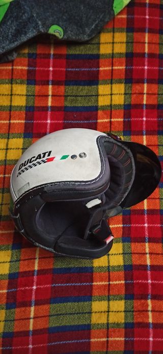 Casco estilo retro de la marca Ducati, con un diseño clásico y elegante. - Color blanco. - Detalles de la bandera italiana. - Visera negra. - Talla 56/59