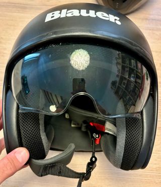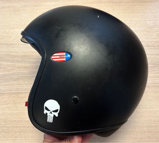 Casco estilo retro de la marca Blauer en talla M. Diseño en color negro mate con detalles. - Logo de Blauer en el lateral. - Calavera estilo Punisher en el otro lateral. Impecable. Muy poco uso