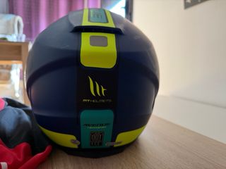 Casco de moto MT Helmets Avenue, azul marino con detalles en verde lima. Está en muy buen estado. - Modelo Avenue de MT Helmets. - Talla xs - Color azul marino y verde lima. - Incluye funda protectora. usado una vez