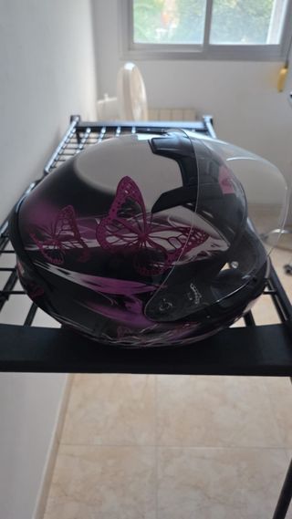Casco de moto con un bonito diseño de mariposas en tonos morados y negros. Se encuentra en perfecto estado, como nuevo. - Diseño de mariposas. - Acabado brillante.