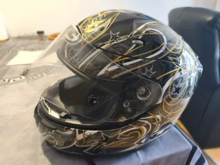 Casco integral para moto con un diseño retro y detalles llamativos. - Acabado brillante en negro con detalles dorados. - Interior con ribetes de cuero. - Visera transparente. - Talla L.