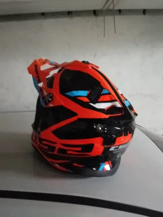 Casco de motocross con un diseño llamativo en naranja y negro. - Visera aerodinámica. - Detalles en azul y blanco. - Acolchado interior.